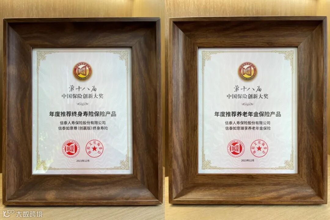 会上,由公众及行业专业人士提名,经过市场调查和专家评审,在2023年第十八届中国保险创新大奖评选活动中,信泰保险的产品“信泰如意臻享养老金保险”荣获“年度推荐养老年金保险产品”奖;“信泰如意尊(创赢版)终身寿险”荣获“年度推荐终身寿险保险产品”奖。