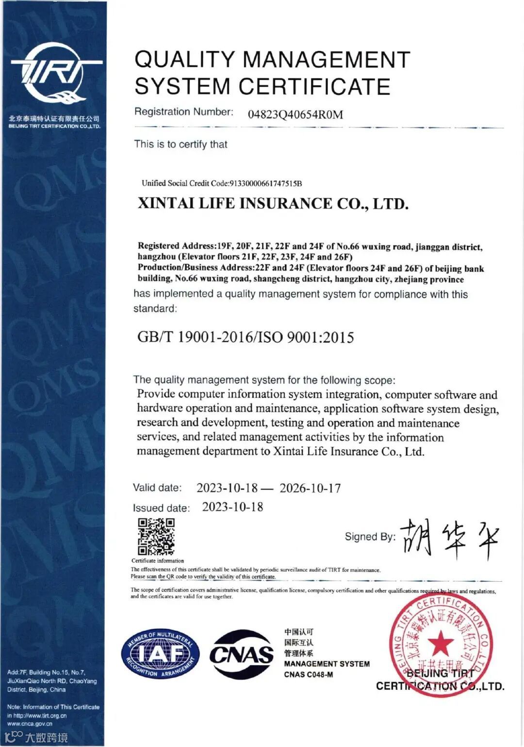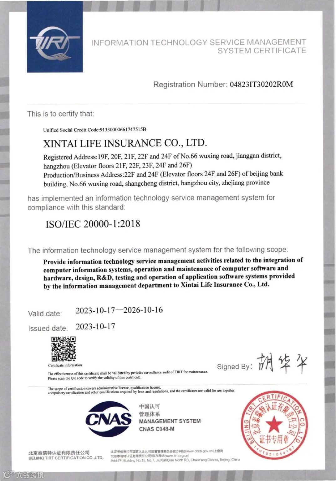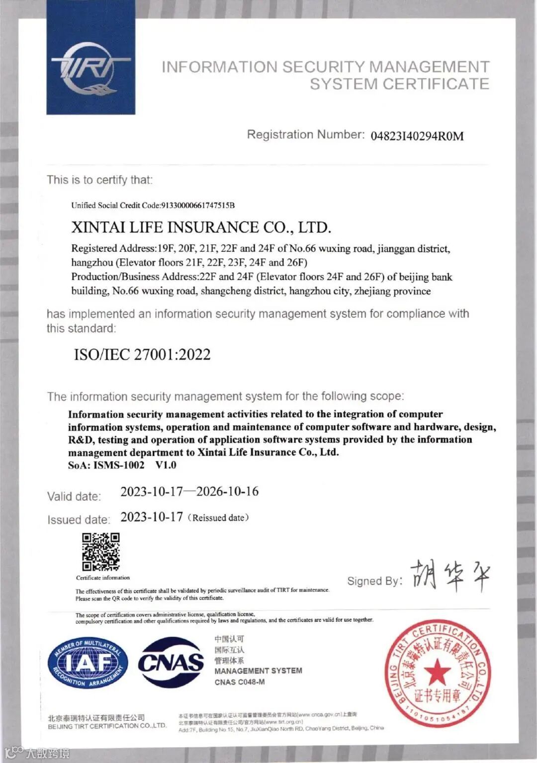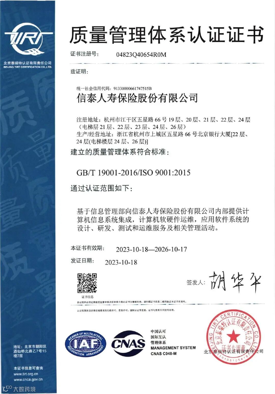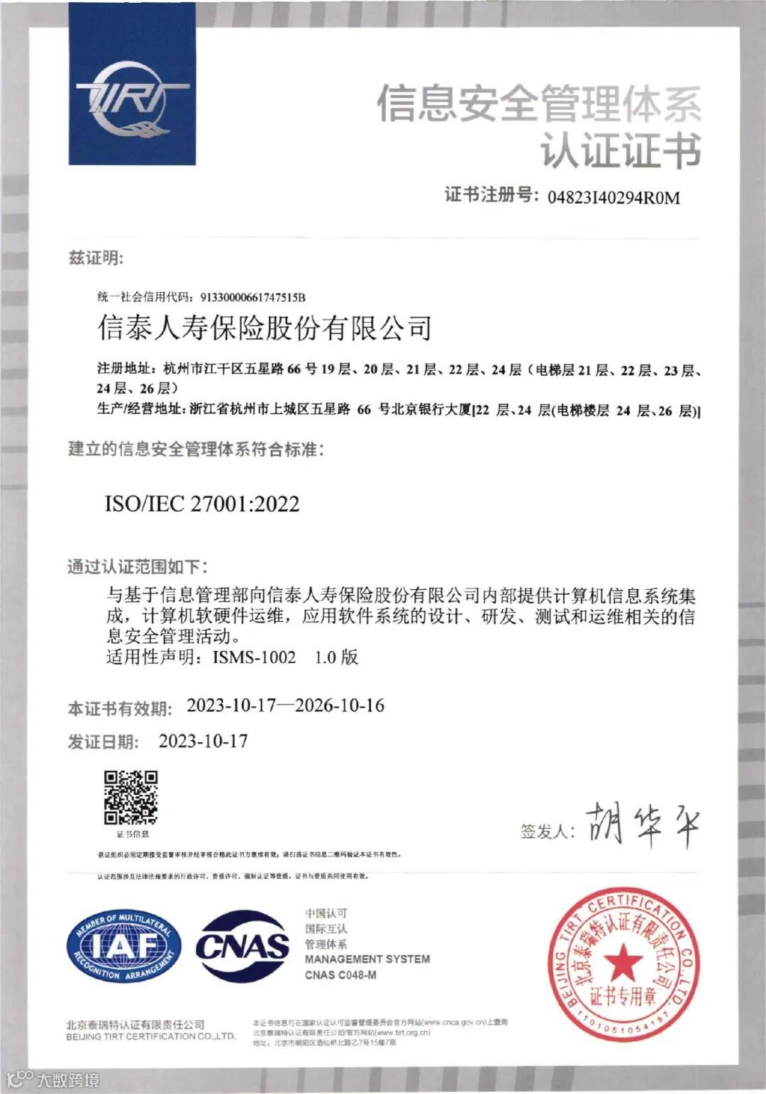 这一系列国际权威认证证书,标志着信泰保险全面规范了信息科技管理、建立起持续改进的良性机制,能够稳定地向客户提供高标准、严要求的产品和服务,发挥产品功能和品牌价值。