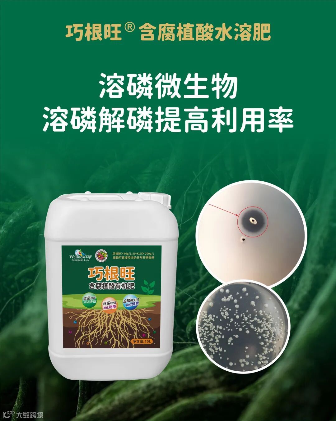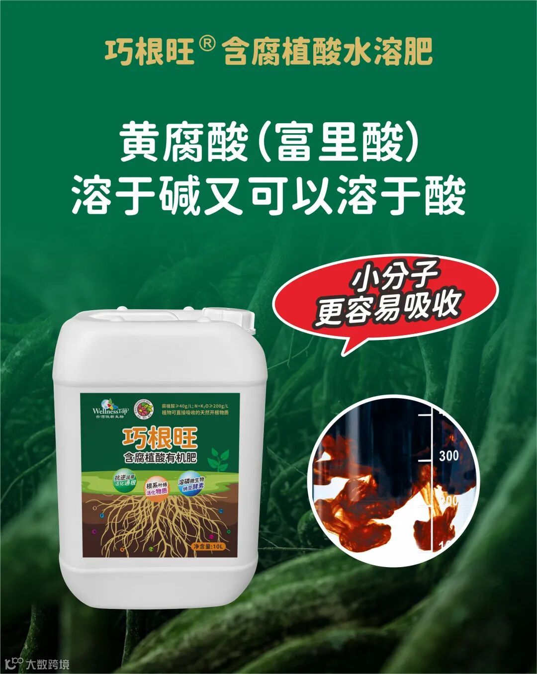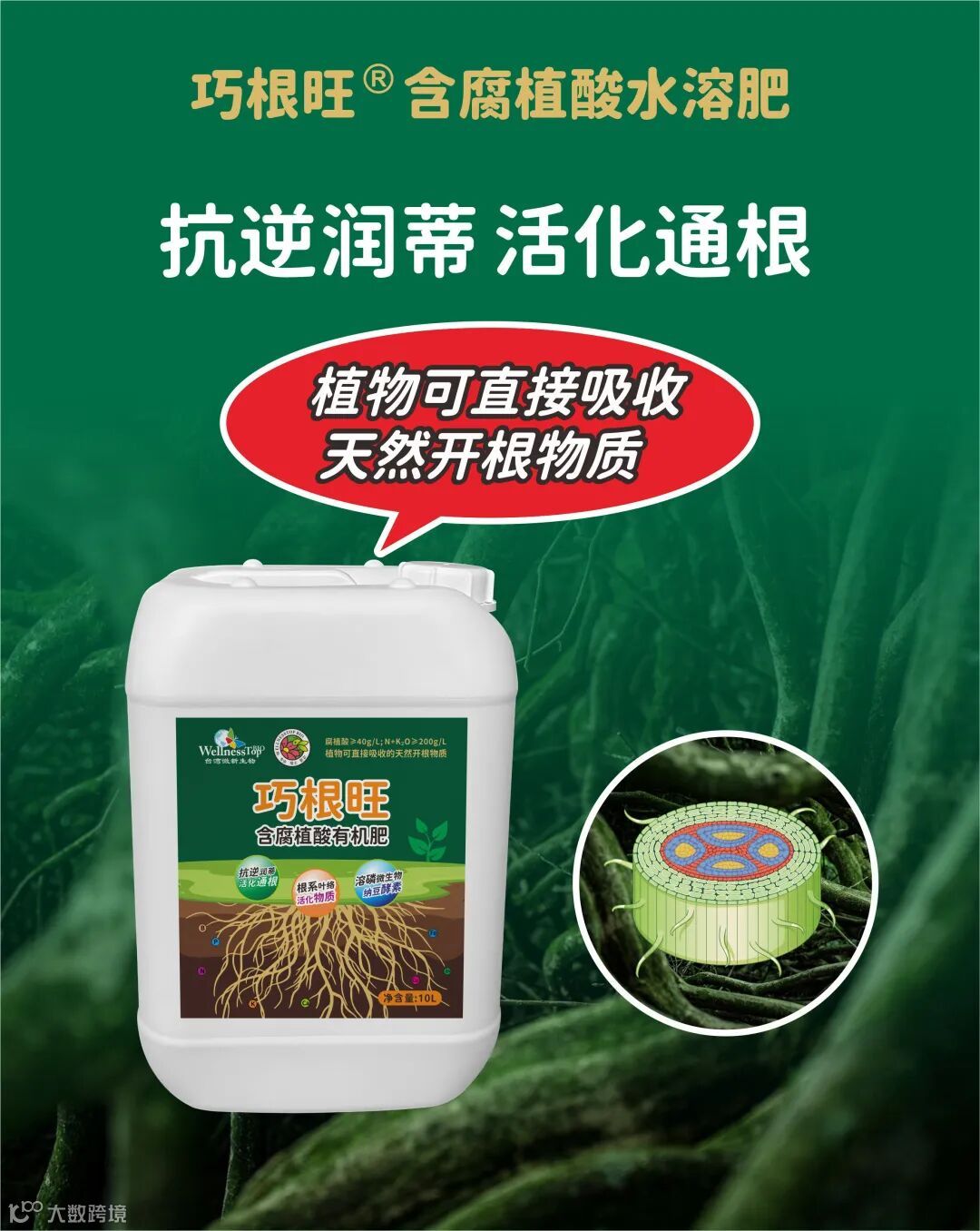土壤干旱或水涝时,作物根系薄弱,出现生理障碍,导致吸收能力下降。腐殖酸水溶肥能抑制蒸腾,减少水分流失,提高抗旱性,促进根系发育,恢复根系活力,提高根系吸收。