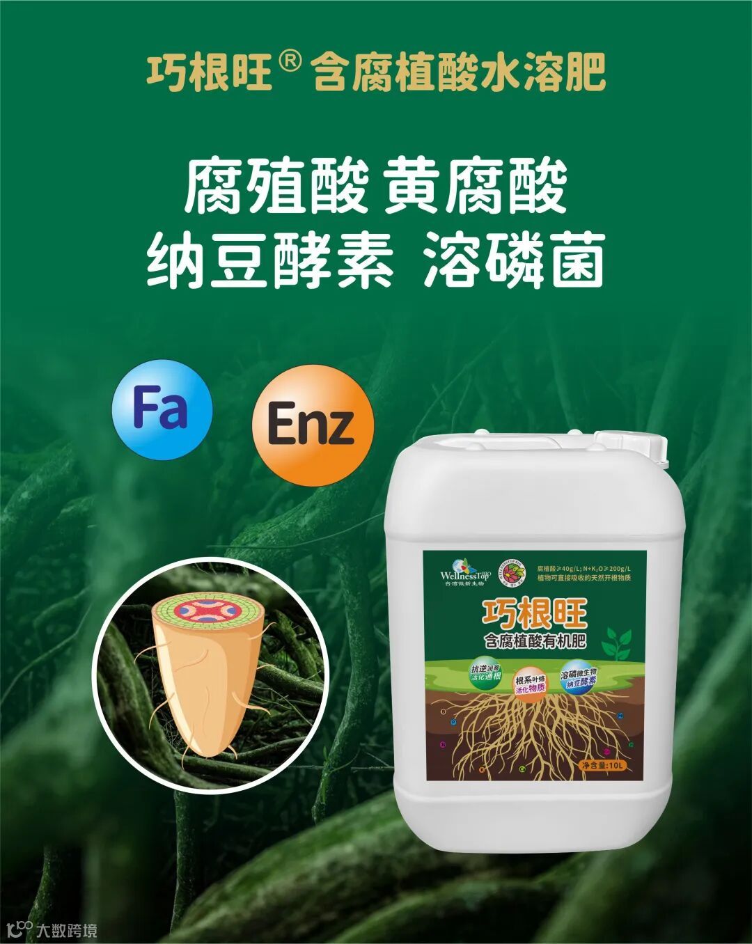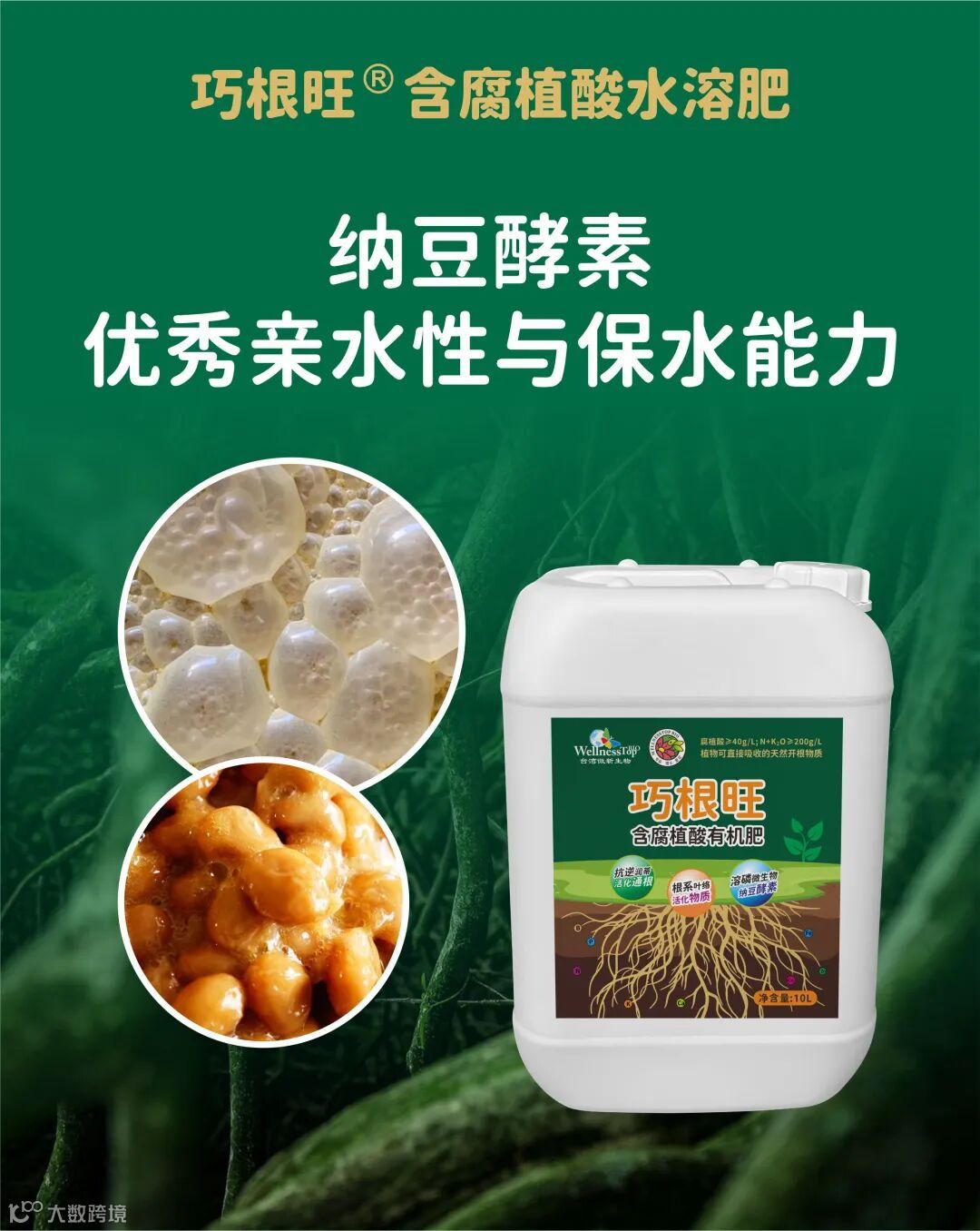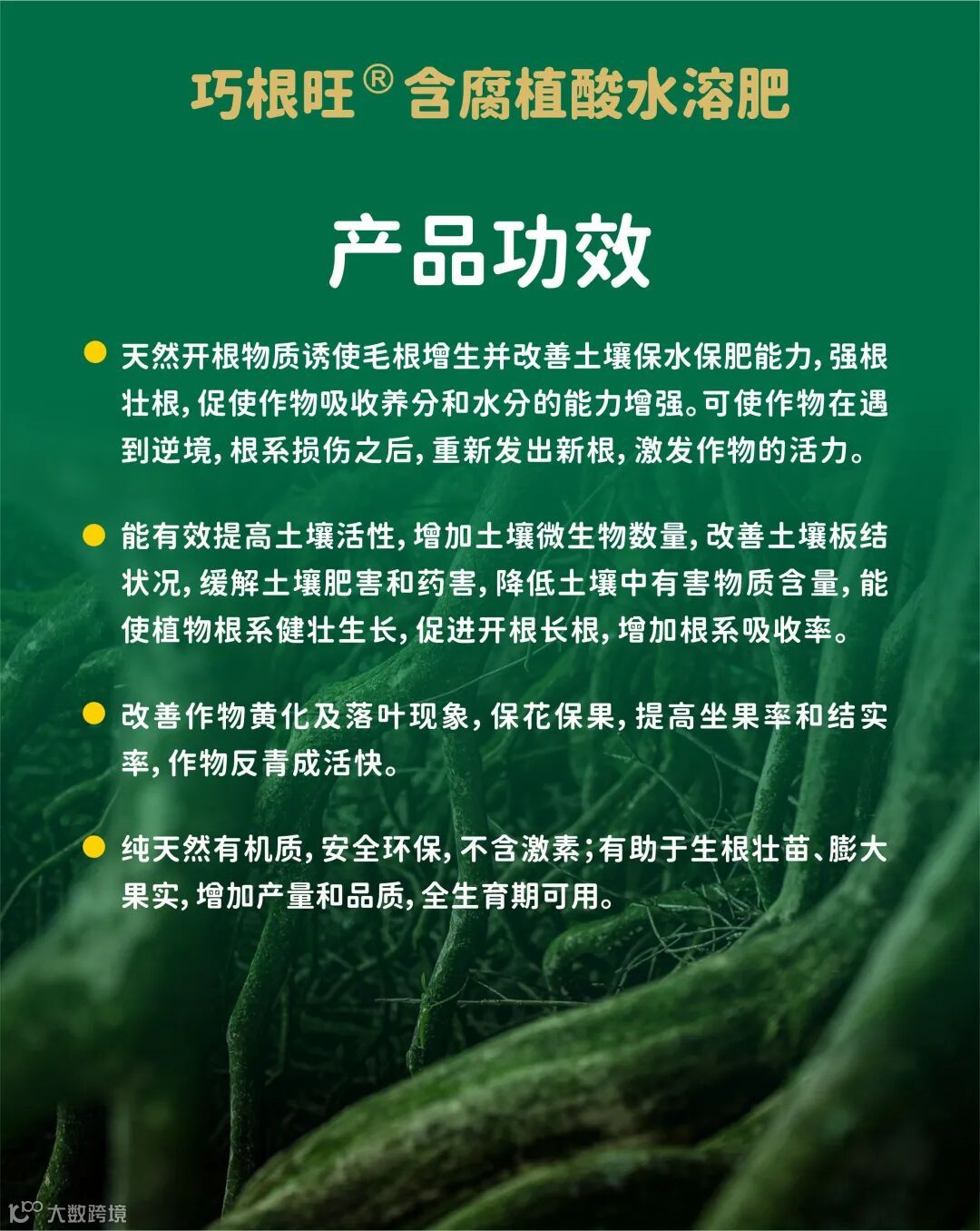 土壤干旱或水涝时,作物根系薄弱,出现生理障碍,导致吸收能力下降。腐殖酸水溶肥能抑制蒸腾,减少水分流失,提高抗旱性,促进根系发育,恢复根系活力,提高根系吸收。
