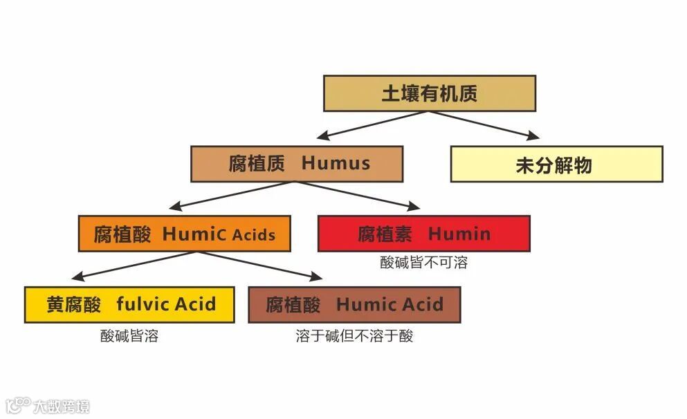 在土壤学中,腐殖酸三类物质命名为胡敏素、胡敏酸、富里酸,在煤化工学中,腐殖酸三类物质命名为黑腐酸、棕腐酸、黄腐酸。其中黑腐酸(胡敏素)指的是既不溶于碱又不溶于酸的腐殖酸,棕腐酸(胡敏酸)指的是溶于碱但不溶于酸的腐殖酸,黄腐酸(富