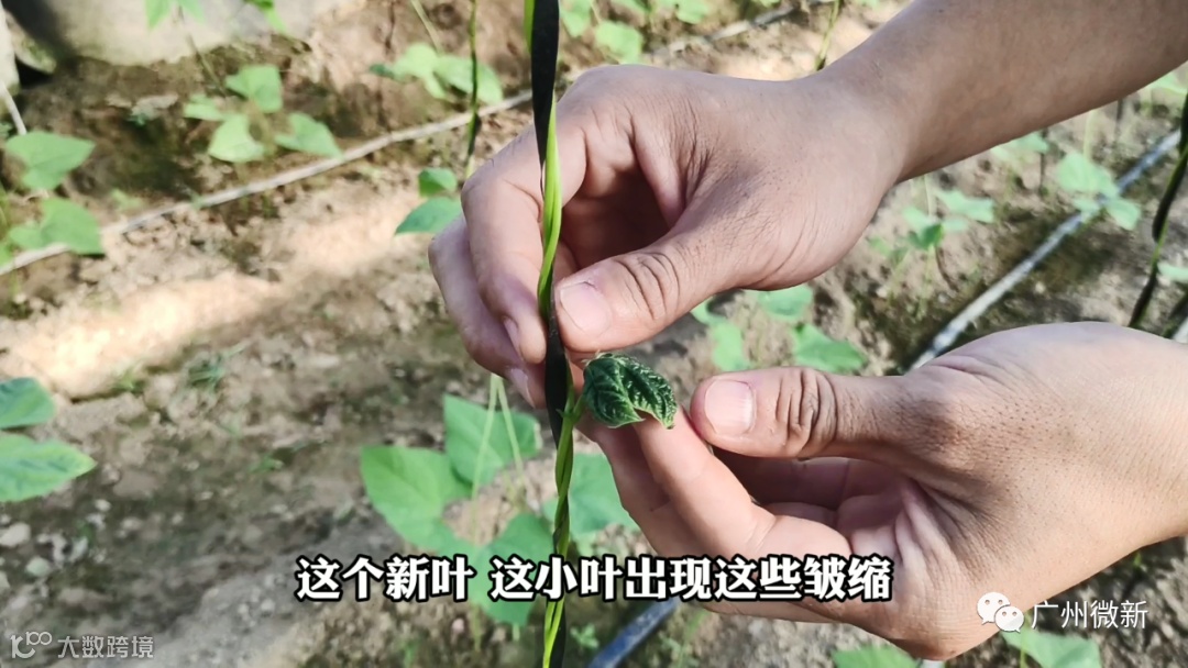以如上视频为例,这是位于山东聊城市莘县的一个豆角大棚。从视频中可以看到,豆角棵子上的新叶不伸展,出现皱缩现象;叶片颜色发黑;叶片从边上开始烂,且稍微有一些干边。棵子龙头上也出现了这个问题。