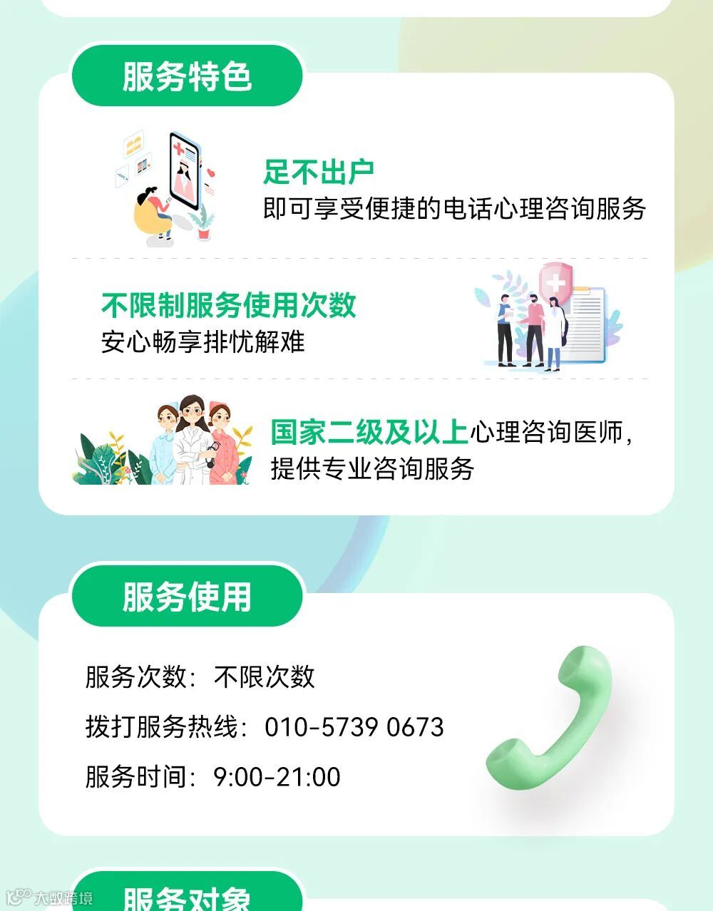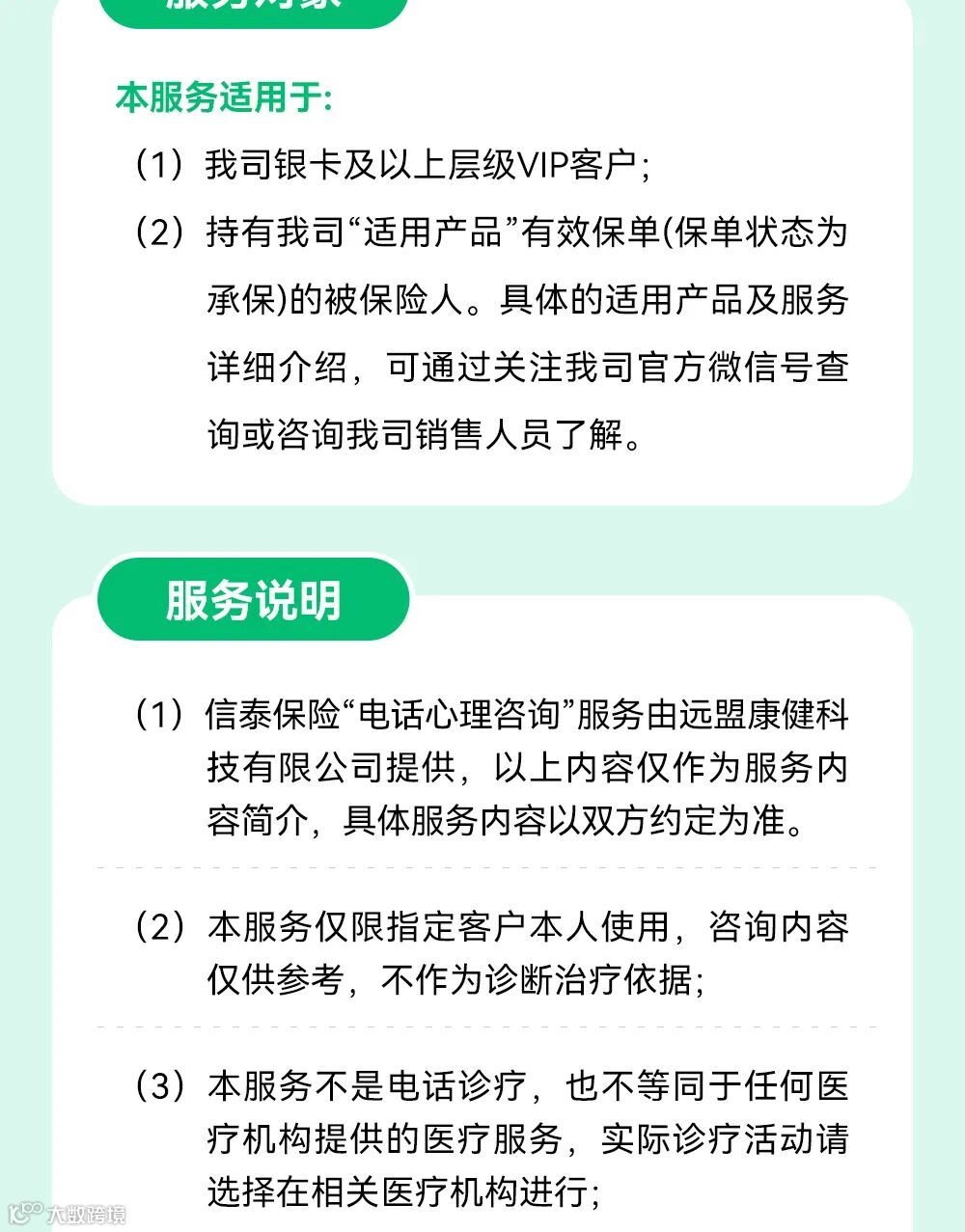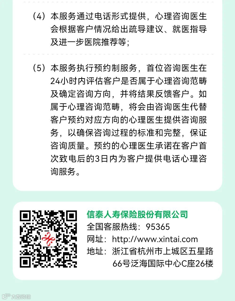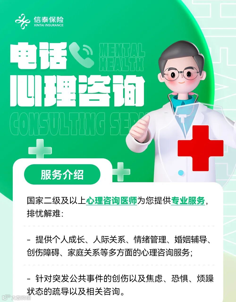 如您想要给自己的心做个‘SPA’,倾诉、疏导、缓解和调节自己的精神压力,获得来自国家二级及以上心理咨询医师为您提供的专业服务,就来了解一下信泰保险的电话心理咨询服务吧。