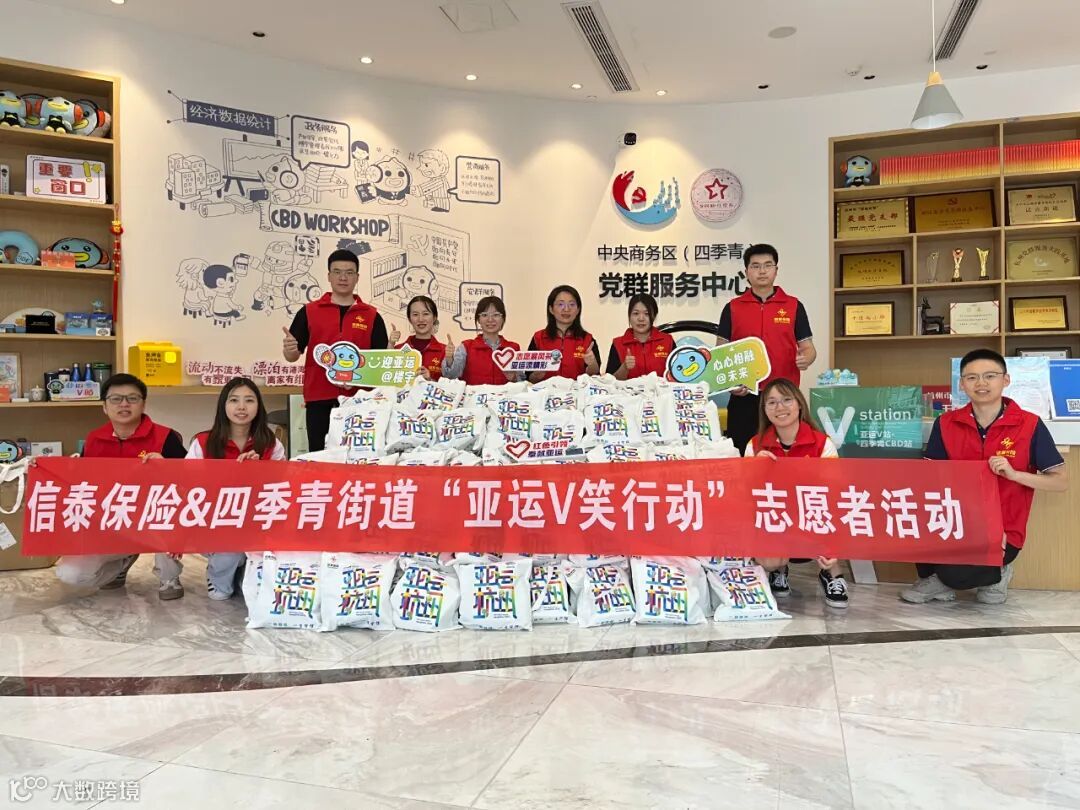 信泰保险还与四季青街道的志愿者们联合开展了一场 “亚运V笑行动”志愿活动。信泰志愿者们为四季青街道办事处、中央商务区(四季青)党群服务中心以及亚运青年V站送去矿泉水、志愿者服务包等爱心物资,并与城市志愿者协作共同为市民提供应急救护和咨询服务,用实际行动诠释亚运精神内涵。
