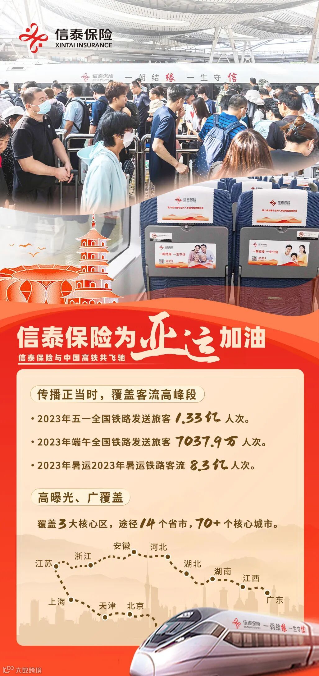 此外,信泰保险还顺利搭载中国速度,冠名高铁列车,与中国高铁共飞驰。信泰保险号专列以杭州为中心,驰骋于京沪线和武广线覆盖的14个省份/直辖市。在车厢内部,信泰全面焕新的品牌Logo、品牌主张等企业文化内容在枕巾、桌贴、天幕等位置铺陈展开,陪伴每一位旅途中的乘客,共同为亚运加油打call!