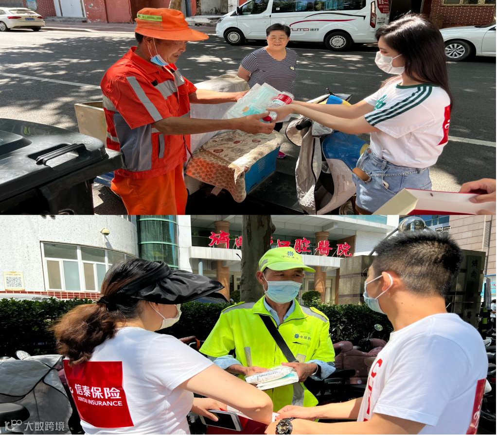 6月7日上午,信泰保险山东分公司综合管理办公室经理王筱涵带领部门全体员工,组成7人志愿者队伍,走上街头,为辛勤工作的环卫工人送上了消暑礼包。环卫工人们拿着消暑礼包,脸上洋溢着开心的笑容。有的拉着志愿者热情地询问公司情况,并就他们关心的各种意外、重疾等险种进行咨询,有的跟志愿者热情地聊起了家常。