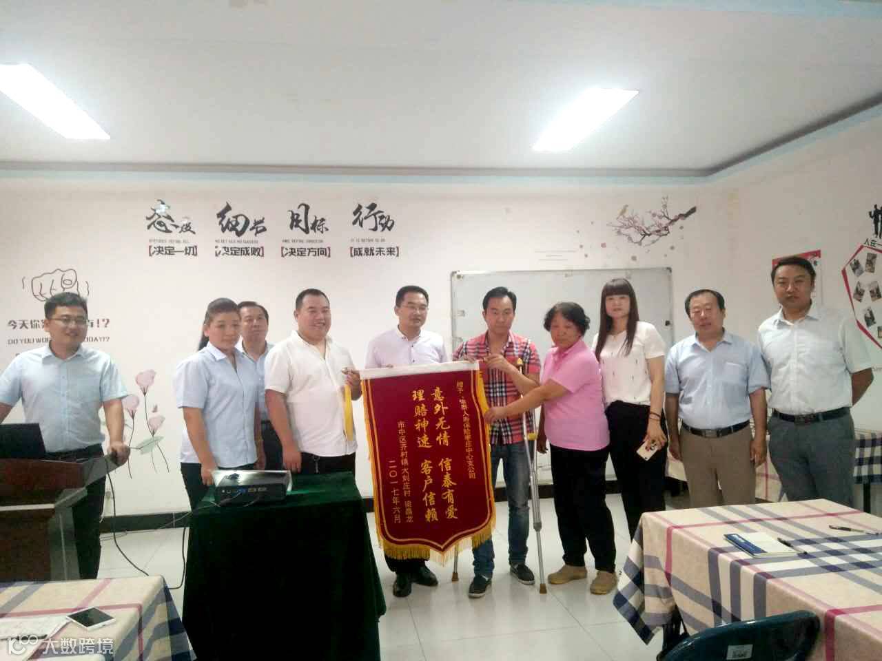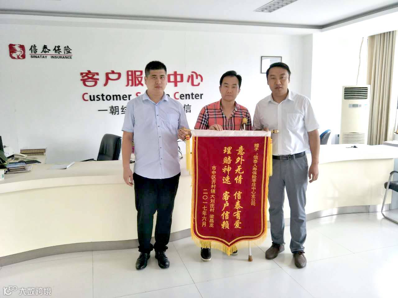 7月4日,家住山东省枣庄市市中区齐村镇的梁先生来到信泰保险枣庄中心支公司送上锦旗,以表达对公司工作人员诚挚的谢意和高效理赔服务工作的肯定。