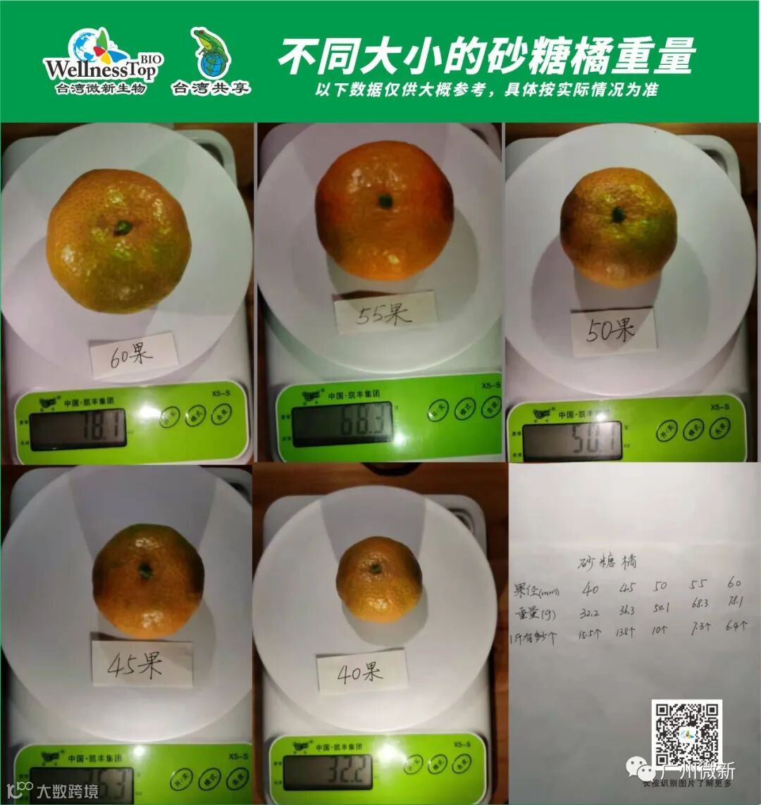 请注意,砂糖橘55果和40果的重量比,不是55比40,而是2比1。同样,沃柑85果和65果的重量比,不是85比65,而是2比1。85果2个1斤,65果4个1斤。