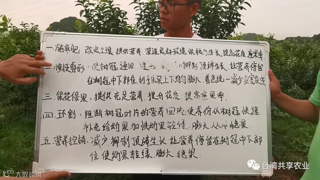 特别提醒:营养控梢要做两次。两次的用肥用药方案一样,间隔10-15天。喷药是里外到处均匀喷施,保证幼果有营养,从而转绿快,又在表面减少夏芽长出。
