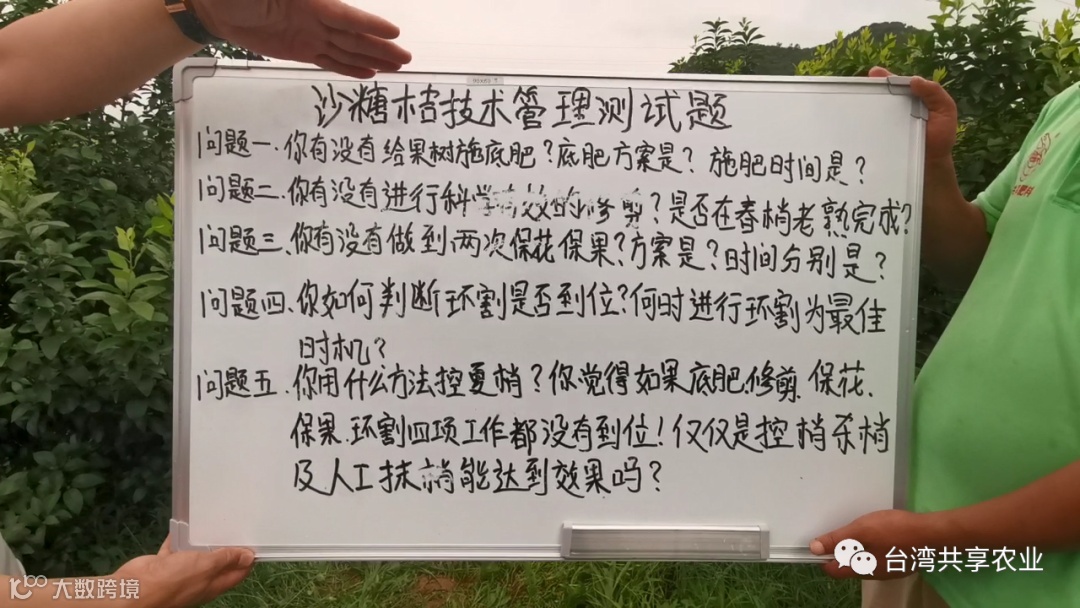 王老师还和大家分享了砂糖橘控梢五大环节的内容,最后还附了一个测试题。果农朋友们可以对照题目进行自测,看看自己哪里没有做好,哪些方面需要加强补足。下面一起来看看吧。