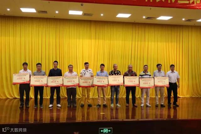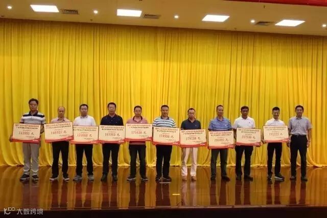 珠江啤酒公司外派监事会专职监事黄恩德为获奖经销商颁奖,华新商贸周金成经理(左二)、莫俊宇经理(左八)、莫启博副经理(右二)领奖