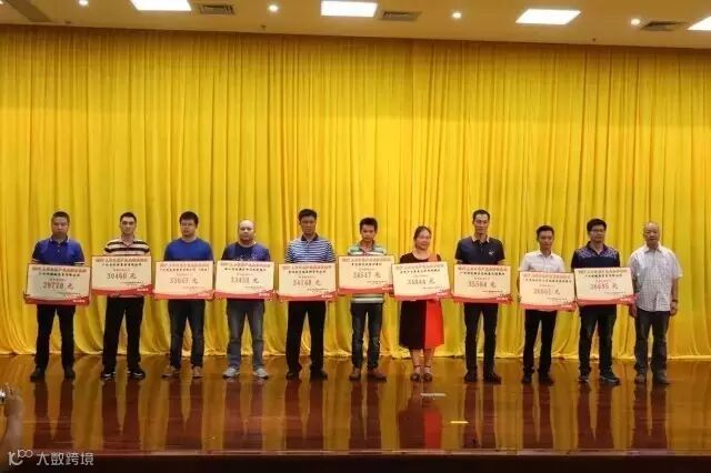 珠江啤酒公司副经理李焰为获奖经销商颁奖,华新商贸邓于辉副总裁(左七)领奖