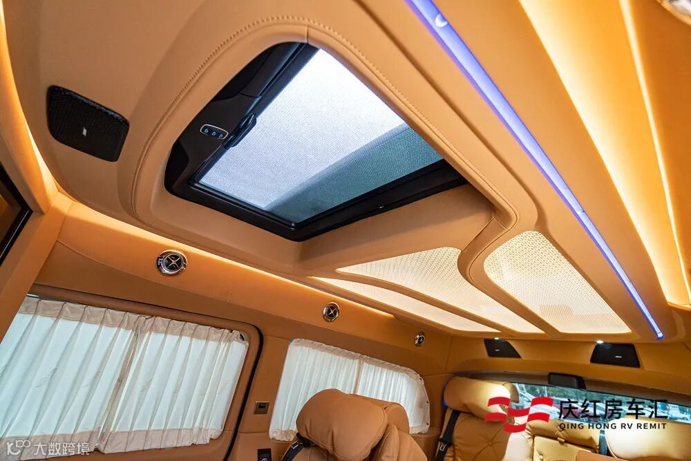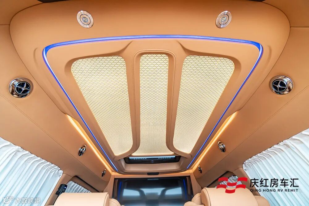 全景天窗+顶灯+流线式氛围灯,与整体的内舱氛围搭配美观大方。加上高档对开的窗帘,打造私密性十足的贵宾舱。