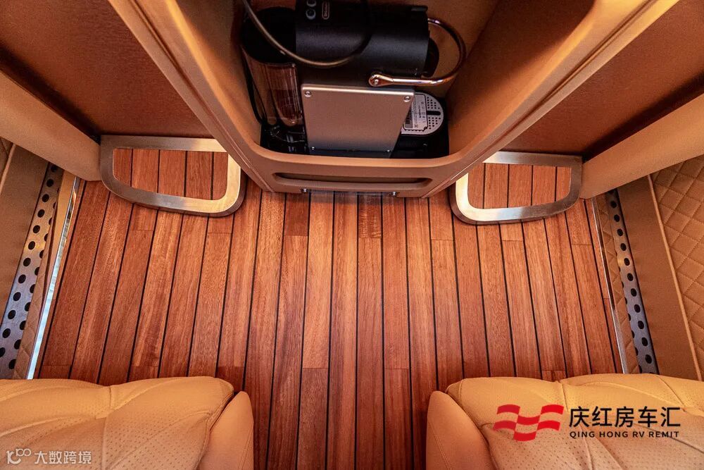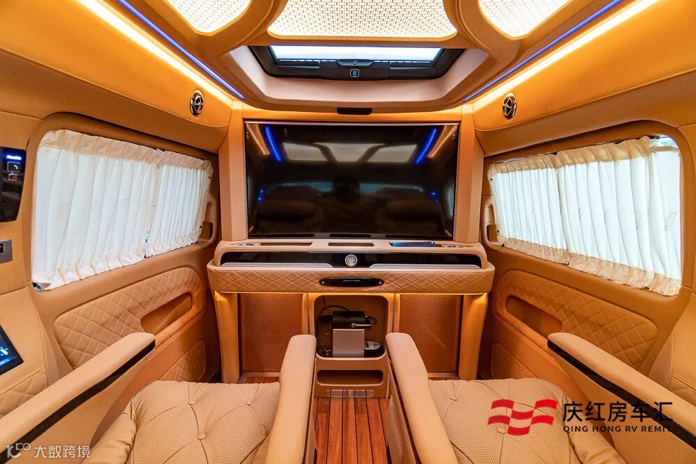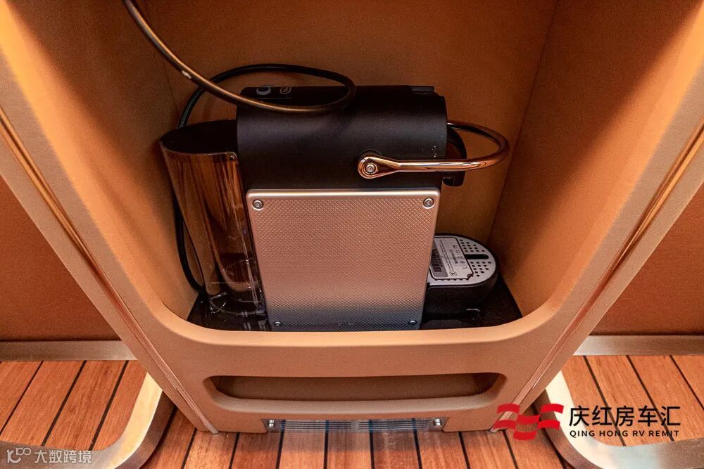 全隔断私密后舱才是这款威霆的重头戏,打开车门可以看到豪华多功能组合吧台,49寸带升降的液晶电视,搭载了BOSE音响,直接媲美影院级影音系统。下方则设计了车载胶囊咖啡机,在做了隔音处理的内舱里,不管是看电视还是喝杯咖啡,体验感都非常好。