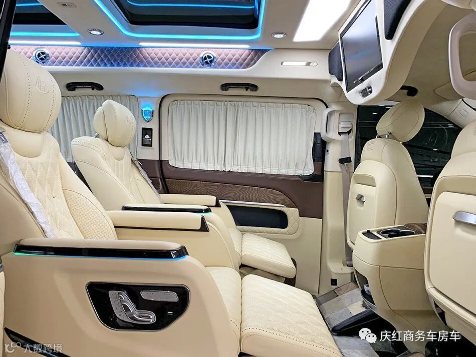 贵宾舱一改奔驰V级原车纯黑的格调,与之替换的是米白的内饰,地板采用牛皮拼接地毯,加上顶棚氛围灯装饰,显得高雅轻奢。