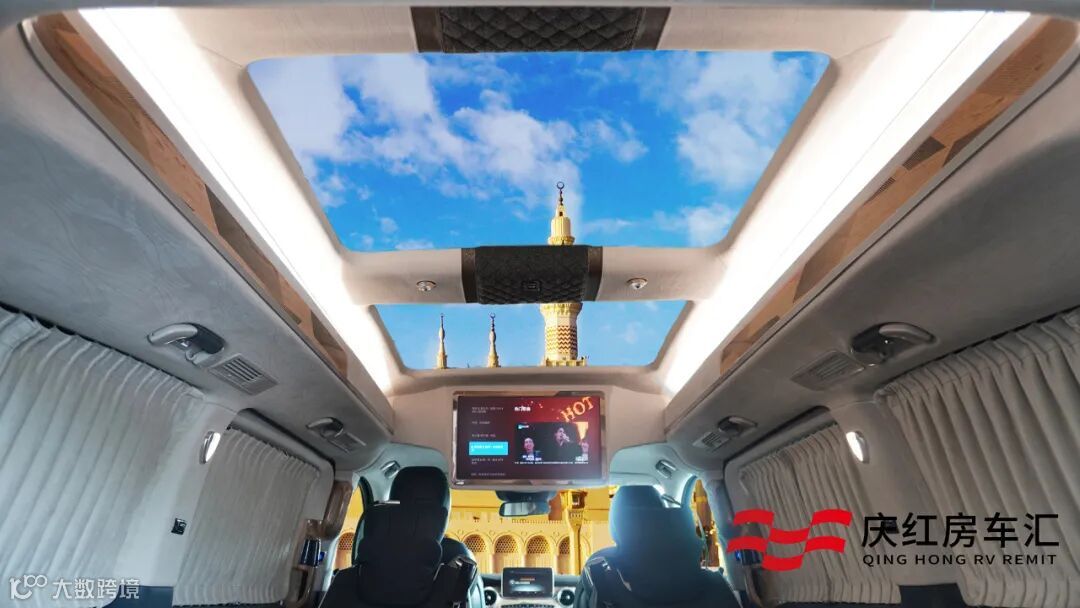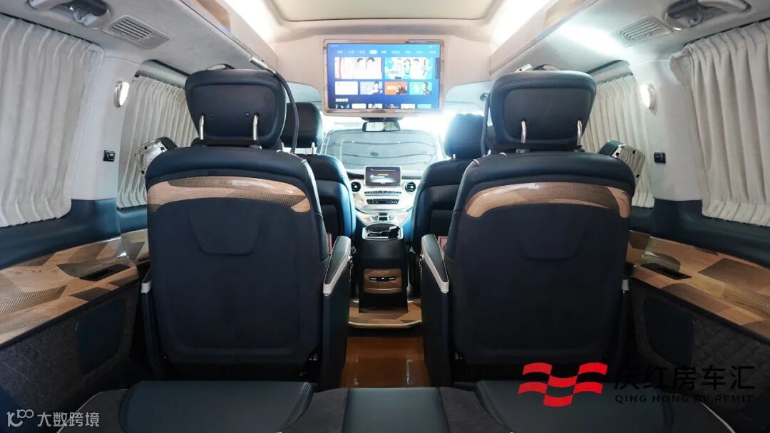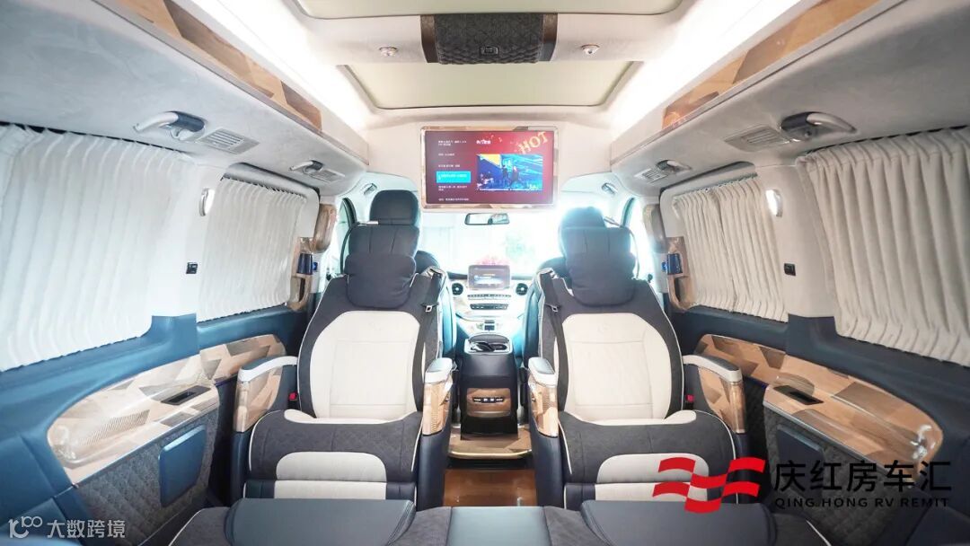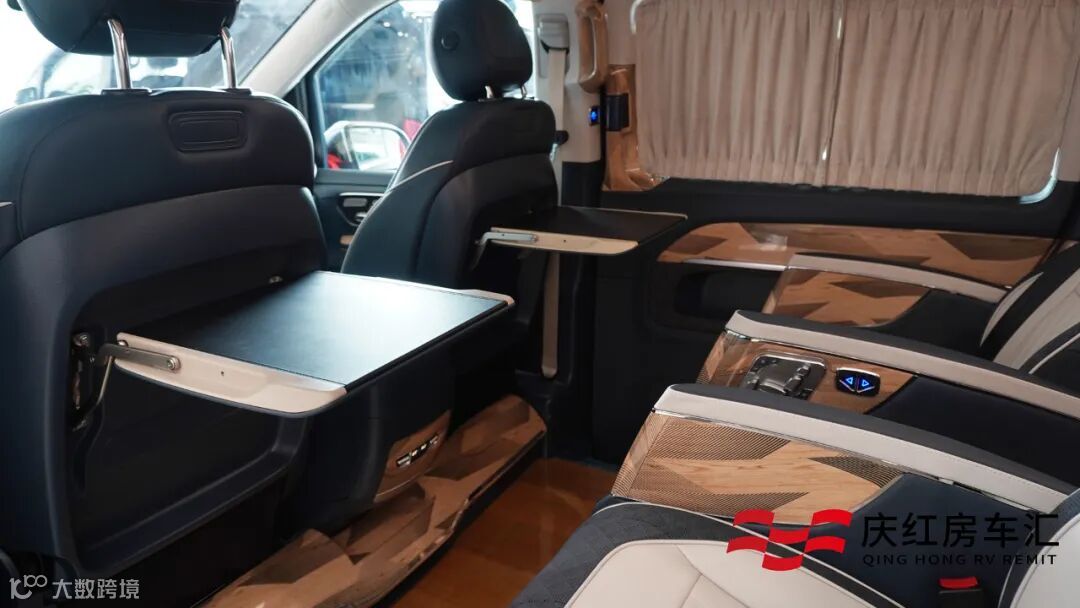 这款奔驰V级顶棚设计高清电视,搭配车内环绕音响,在私密安静的舱内,视觉和听觉都一级棒。下方搭配可折叠小桌板,可办公更可以放小零食饮料等,享受一旅途的惬意。