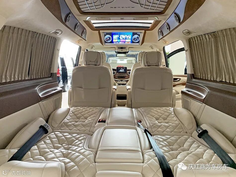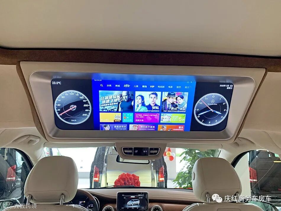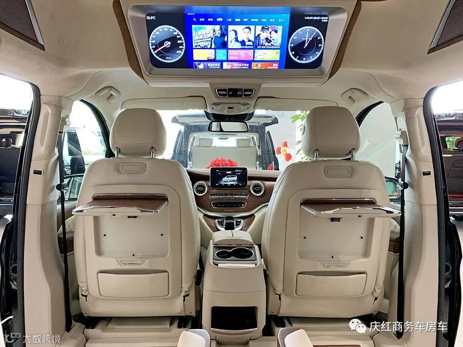 这款奔驰V级也完美兼顾了车内的娱乐性,车顶上方设计25.5寸多功能电视,电视框采用电镀装饰件,且车内搭载车载Wi-Fi,无线充电设备等,给出行带来更多娱乐的可能。