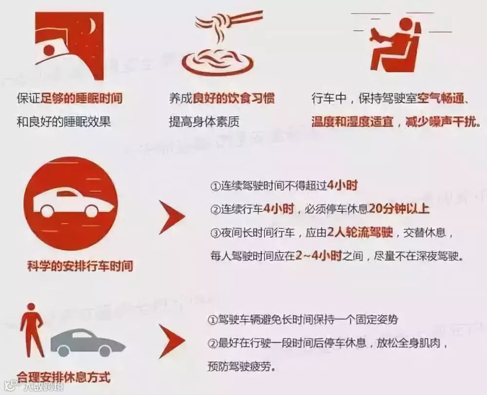 连续驾驶超4小时应停车休息20分钟以上,保持精力充沛,防止疲劳驾驶。长途客车驾驶人夜间行驶时切勿疲劳驾驶,并要严格遵守凌晨2点至5点停运规定。