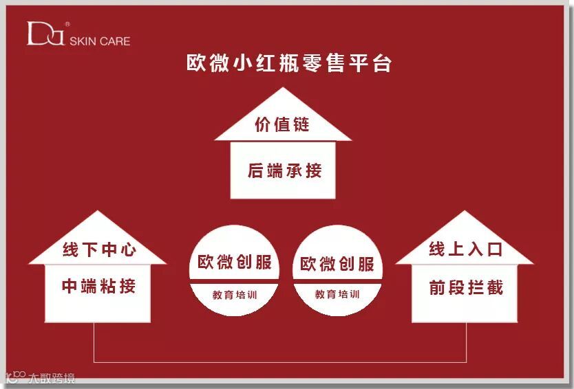线上入口:欧微在前端通过“小红瓶套装”产品打造爆品经济和分享经济,用超高的性价比向市场发售,以千军万马的姿态,获取线上前端渠道的流量。