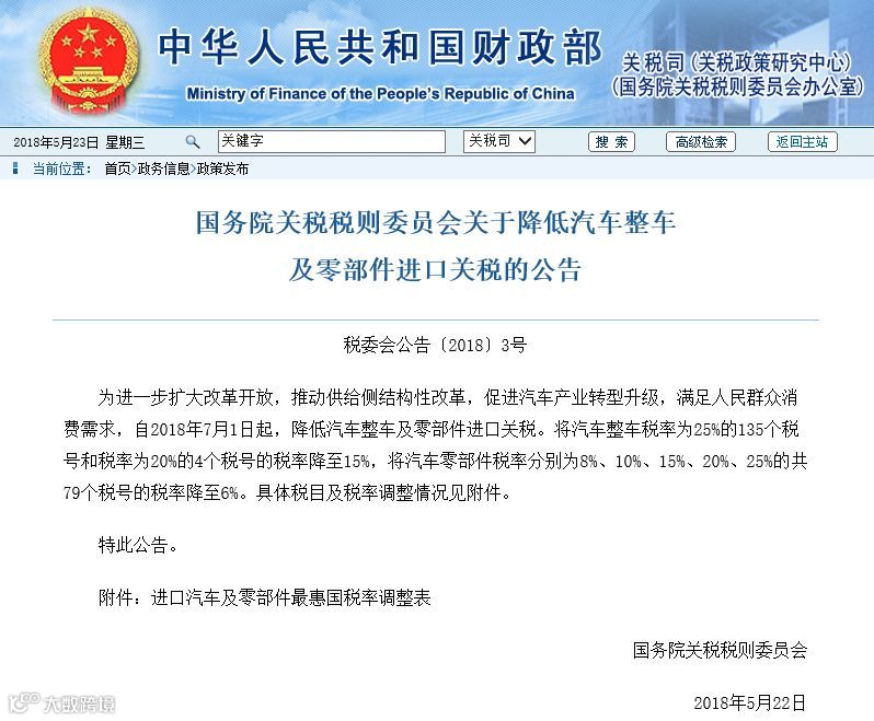 国务院关税税则委员会22日公告,自2018年7月1日起,将税率分别为25%、20%的汽车整车关税降至15%,降税幅度分别为40%、25%将税率分别为8%、10%、15%、20%、25%的汽车零部件关税降至6%。