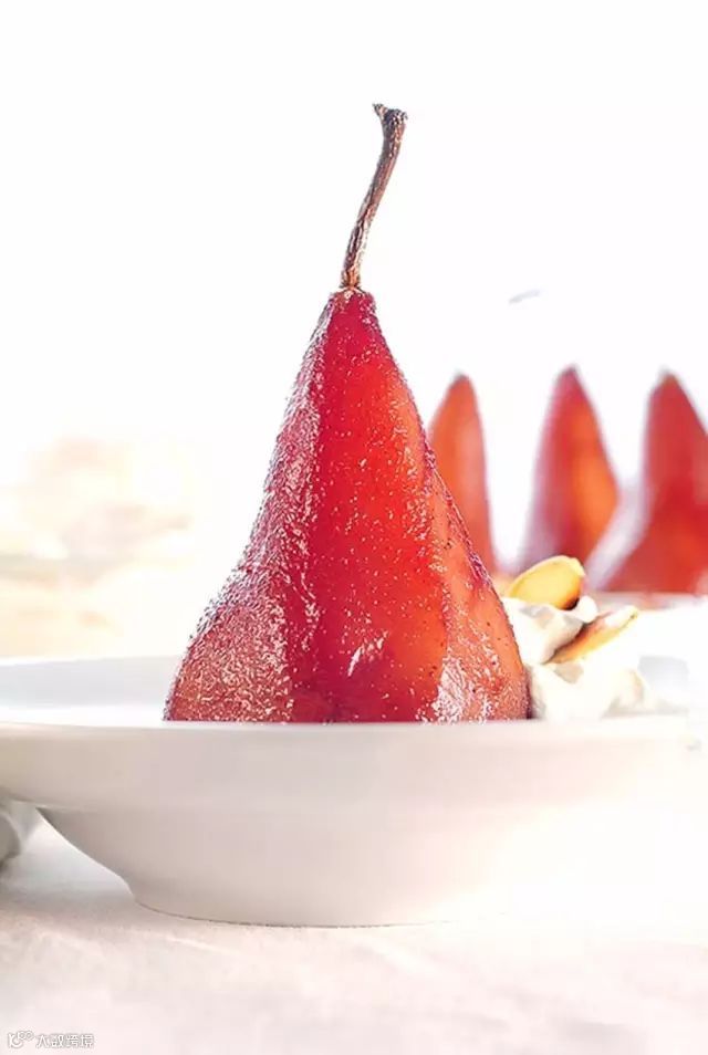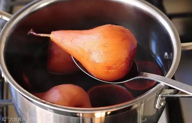 材 料 2杯水、1杯红酒、1勺红糖、4个梨、1个橙子