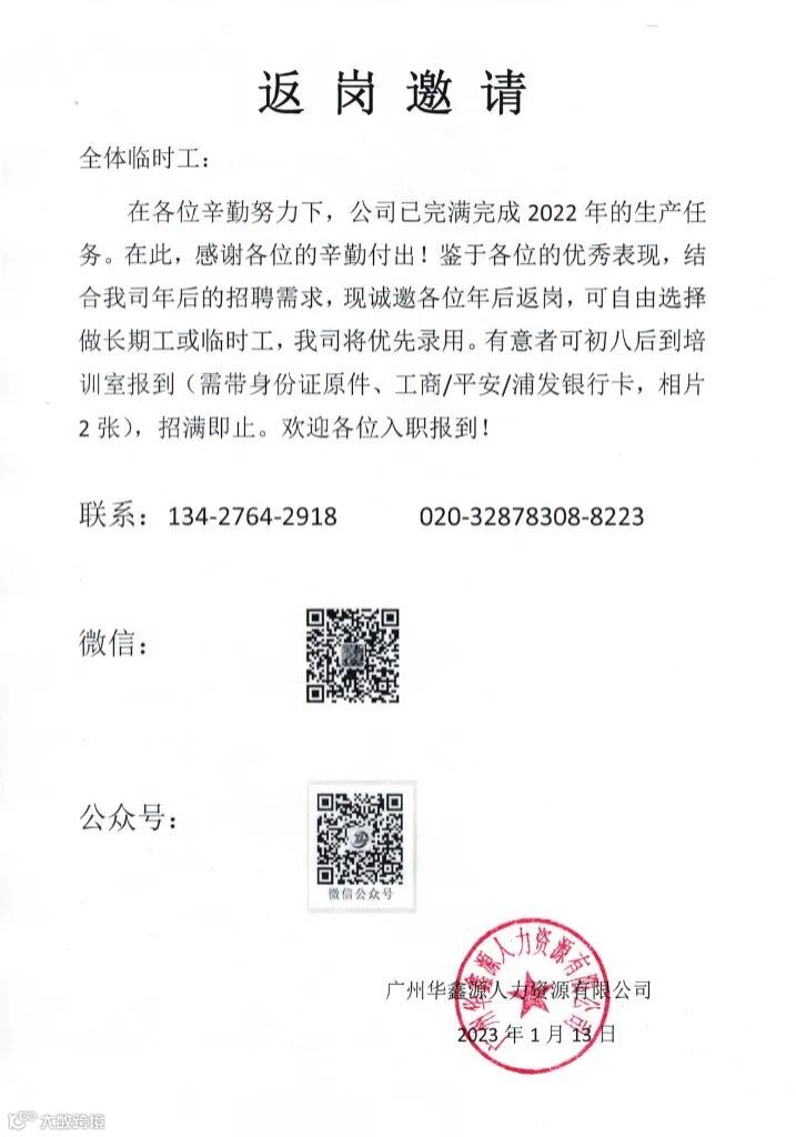 导读:诚邀各位年后返岗,可自由选择做长期工或临时工,我司将优先录用。有意者可初八后到培训室报到。