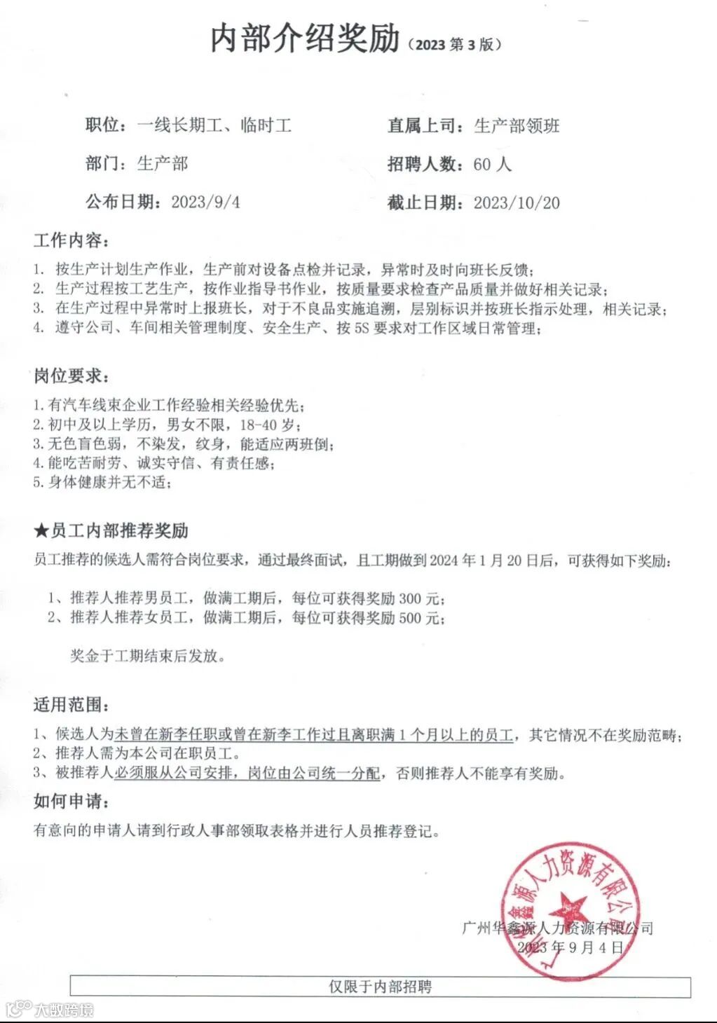 待遇:底薪2300,加班按劳动法计算(平时1.5倍,周末2倍,法定节假日3倍),岗位补贴+绩效奖+全勤+车补