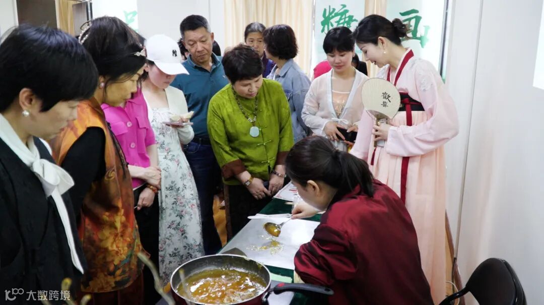 两位糖画非遗传承人进行糖画制作演示:用铜勺舀起已熬制好的糖液,在大理石上自如作画。客户们仿若回到童年,围绕着糖画传承人的摊子,边学边讨论。在两位老师的指导下,客户完成了自己的第一幅糖画创作,一边拍照留念,一边“打包”带回家与家人分享。