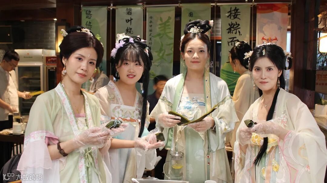 穿着汉服、新中式类服饰的客户们,汇聚在青砖瓦漆、古风古韵的场景中,听非遗主讲人讲述五芳斋粽子的由来与发展和五芳斋粽子制作技艺。