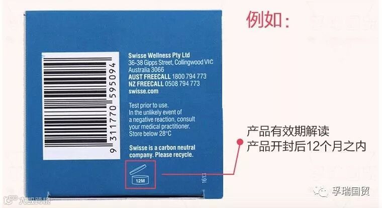 备注:Swisse产品都是在澳大利亚生产的,澳洲的法规并不要求护肤品标注产品生产日期;Swisse产品工艺也能保证未开封的品质,所以并没有标注。在产品瓶身上,有一个标识,是一个盖子打开化妆品小图标,上面有一个代表月份的数字及字母“M”,就是这个产品开盖后的有效期了。