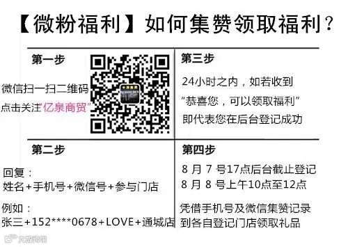 8月7号17点后台截止登记,8月8号上午10点—12点进店领取礼品,过期无效!