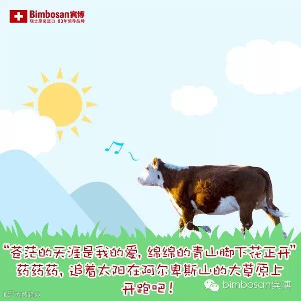 来自瑞士的Bimbosan宾博知道:只有最安全的奶源作保证,才是妈妈的安心之选。作为100%瑞士原罐原装进口的好奶粉,我们保证Bimbosan宾博的奶牛,绝对是在阿尔卑斯山的天然草场茁壮成长,从而为宝宝带来最高品质的奶源,让宝宝尽情释放天性,健康无忧成长!