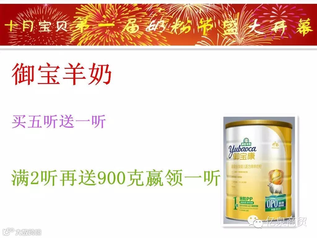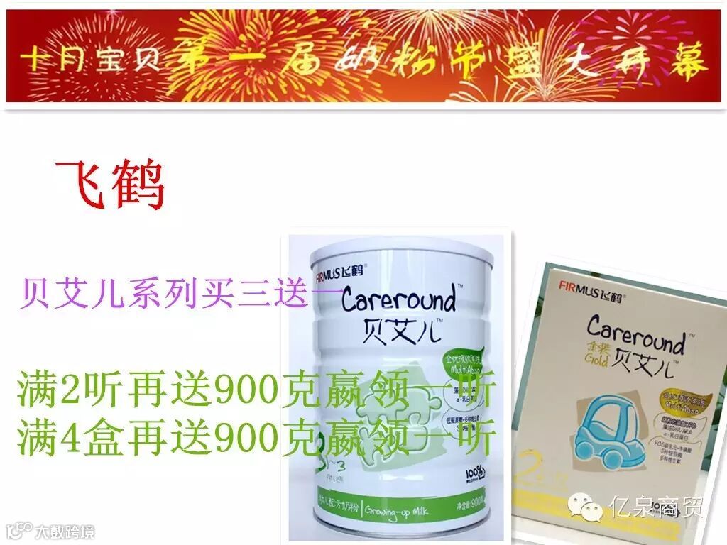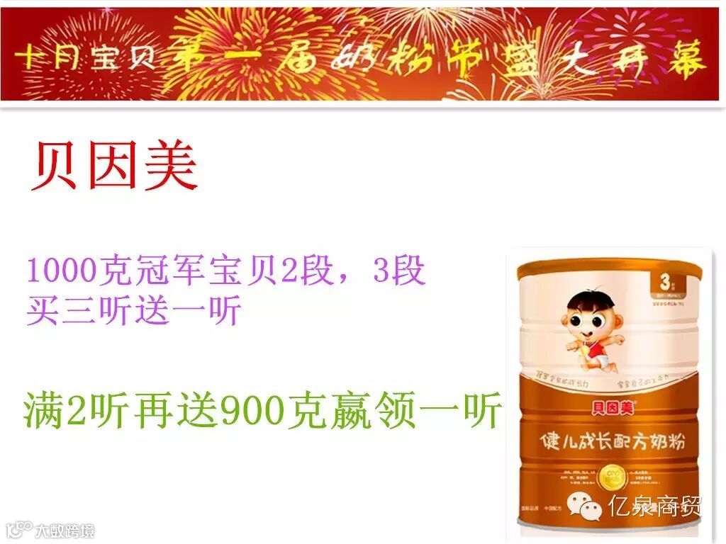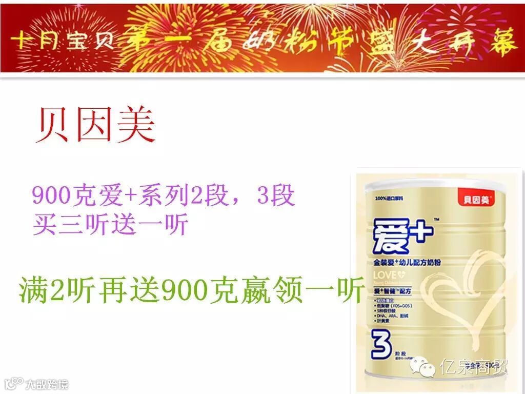 此次奶粉节活动,由贝因美公司提供200000万元奶粉举办,十月宝贝店内全场奶粉满2听就送价值108元贝因美嬴领学生奶粉一听,赠送力度当前邳州最大,奶粉品牌最全,价位最低,全部厂家直供,给您最贴心的保障。