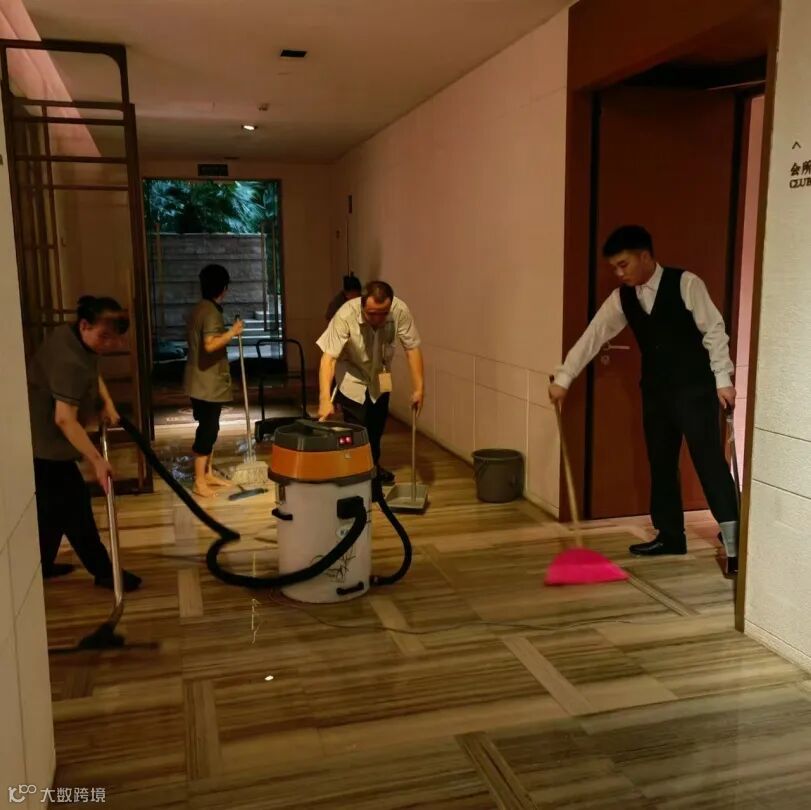 保洁团队每日对大堂玻璃、大堂格栅、园区景观水池、楼层通道、后楼梯、儿童房、会所餐厅、会所健身房等区域进行深度清洁,夜间对各楼栋大堂及负层地面石材进行晶面养护。