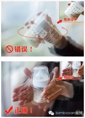 正确的冲调奶粉的方法是:双手手掌夹紧奶瓶,来回滚搓,很快就能让奶粉充分溶解,又不会起泡!
