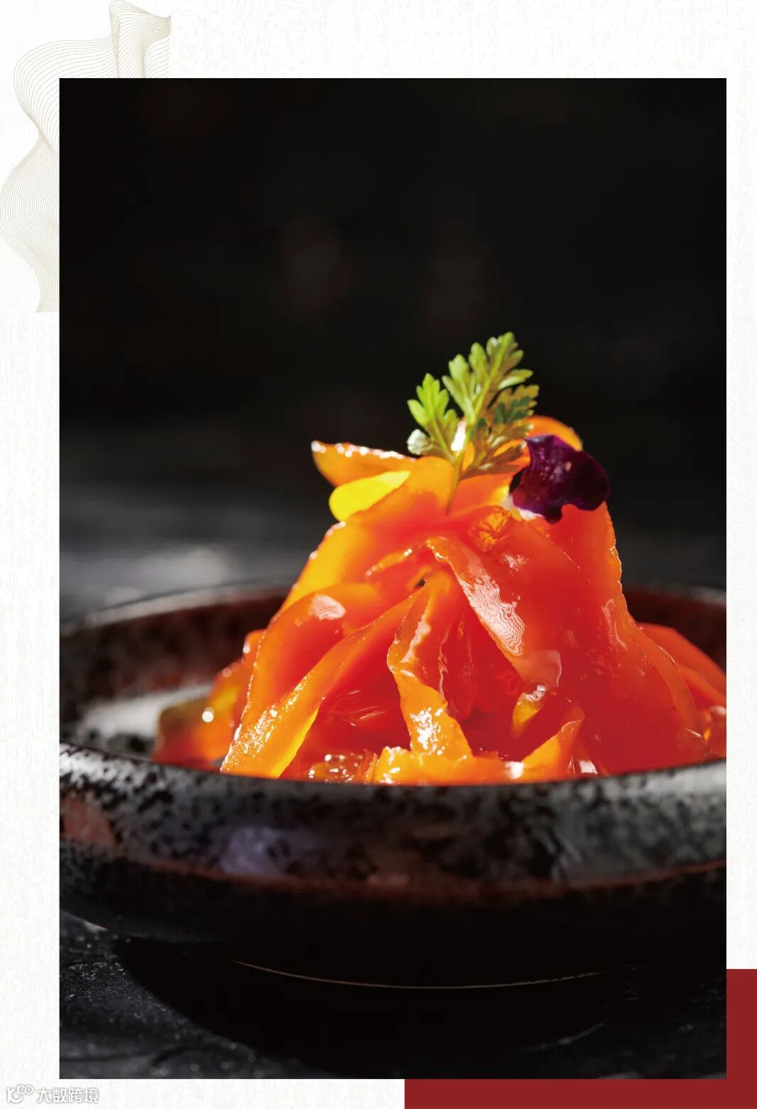 开胃前菜,巧用天然食材唤起舌尖新想象,糖醋酱汁按照严格比例调配,耗时一天一夜并浓缩烹制而成。看似木瓜,食似木瓜,一口下去,却是酸甜爽口的萝卜,很奇妙。