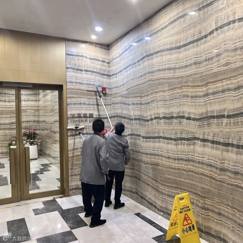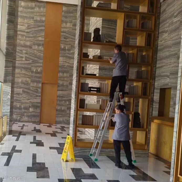 保洁团队每日对大堂玻璃、大堂格栅、园区景观水池、楼层通道、后楼梯、儿童房、会所餐厅、会所健身房等区域进行深度清洁,夜间对各楼栋大堂及负层地面石材进行养护。