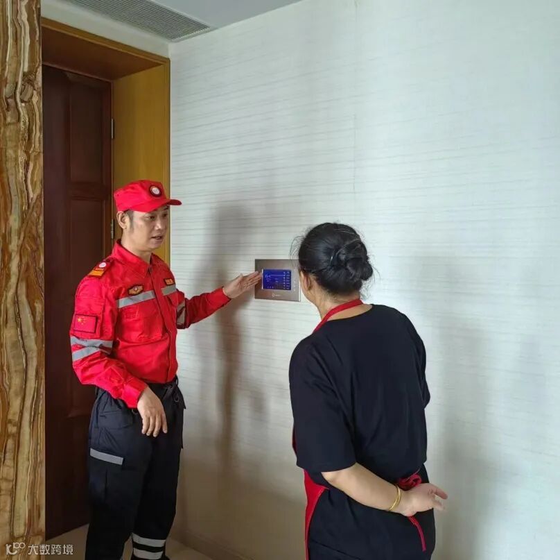 为确保小区的消防安全,客服服务中心安排专业消防维保工作人员进行安全消防到家服务,工作人员耐心讲解单元内烟感、可视对讲机、消防应急按钮开关、电梯厅消防栓、灭火器、防毒面具、后楼梯消防门禁等设施设备的正确使用方法。
