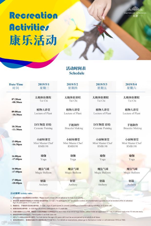 假期最后一天,让孩子畅快玩耍。庄园新增了儿童游乐设施,康乐中心也安排了丰富多彩的活动——DIY陶瓷彩绘、植物大讲堂,小厨师课程等,寓学习于游乐之中,为温馨的假期画上圆满句号。
