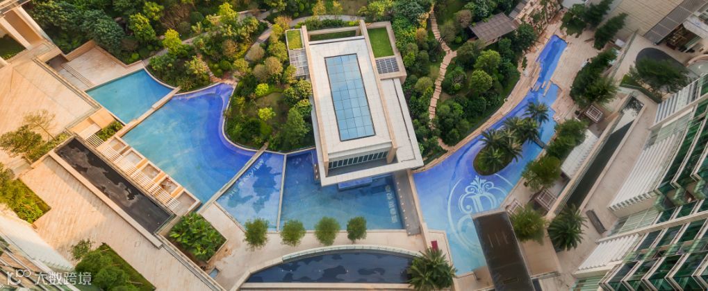 简洁大气的椰林大道与充满现代感的建筑风格相呼应,并且与植被丰富繁密的下沉花园形成对比。此外,水景还和室内、户外泳池在外观效果上做了衔接,整体一气呵成。