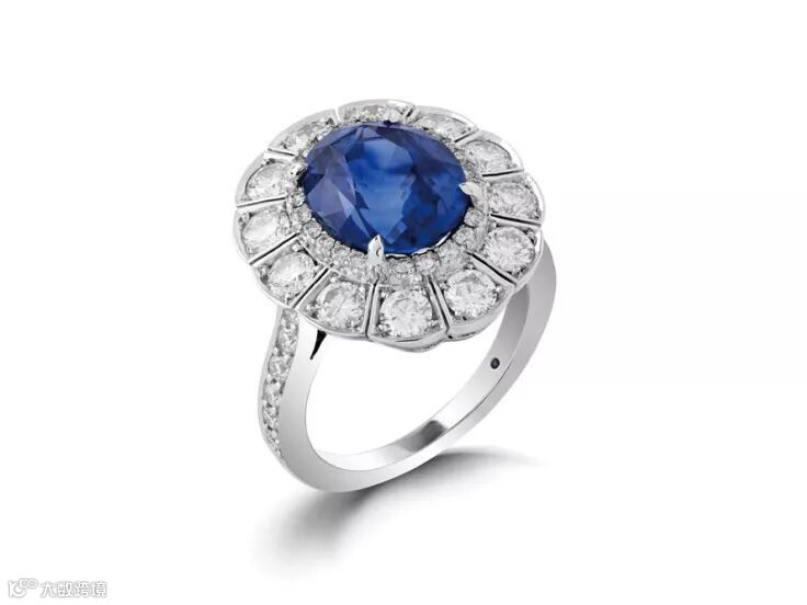 这枚蓝宝石戒指,由世界上历史最悠久的皇家珠宝商,House of Garrard专门定制,采用18K白金戒托,中间镶嵌了一枚12克拉、椭圆形的锡兰产蓝宝石,四周则由14颗高品质的南非钻石衬托。