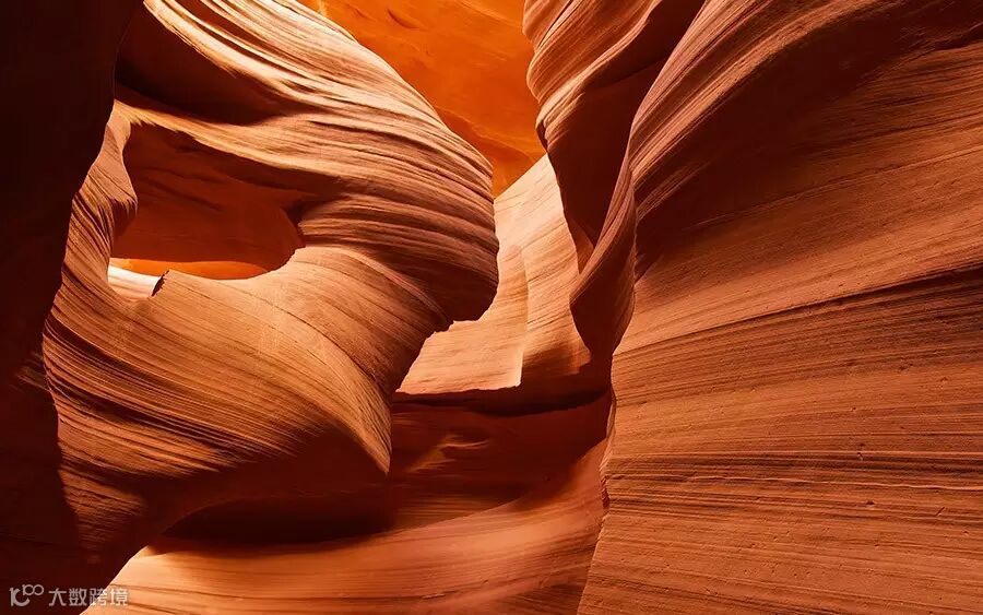 400多米长的羚羊峡谷,如同赤红大地上一条不起眼的细缝,不加以留心根本没人会发现。但是当穿过那个仅有一人宽的入口时,无疑在短短数秒内走完了连接异界的隧道,瞬间置身在五彩斑斓的魔幻世界当中。那看似柔软而异常坚硬的谷壁,仿佛经过精心打磨,光滑而无瑕疵,橘红色的纹层顺着岩壁流淌,宛如几世纪年前的波浪被定格在这峡谷中。