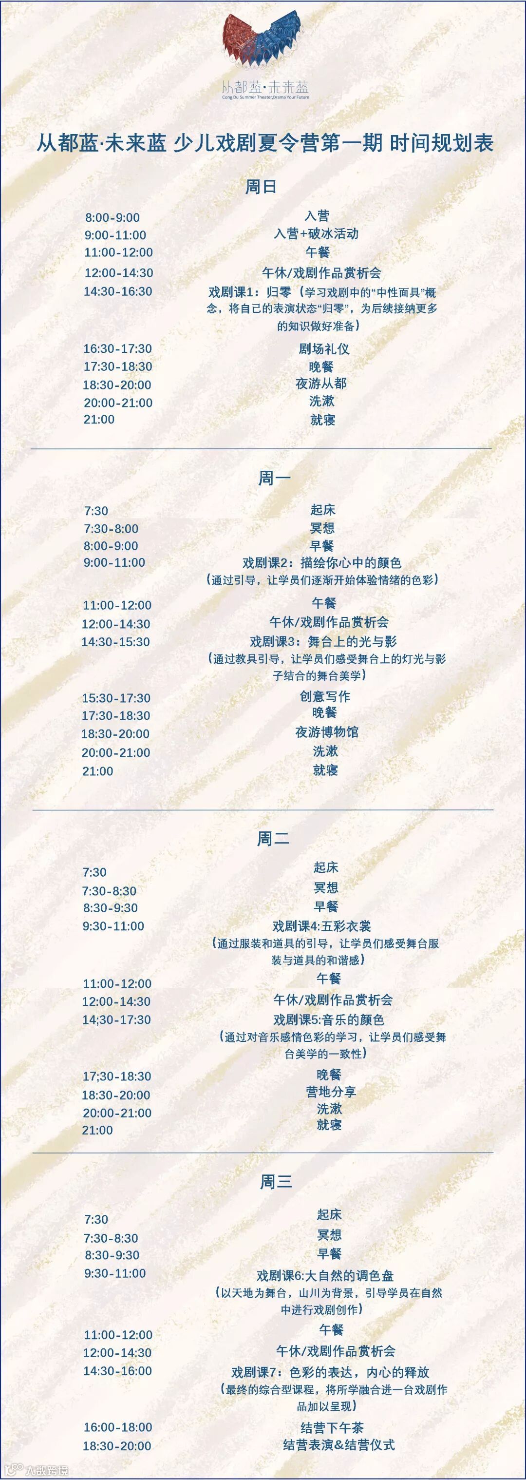 *请各位报名的学员以“从都蓝”作为题材,以绘画、音乐演奏、舞蹈、表演或文字创作一个艺术作品,发送至“从都蓝·未来蓝”官方报名邮箱reservations@imperialsprings.com ,我们将从中择优选拔出本次的学员。