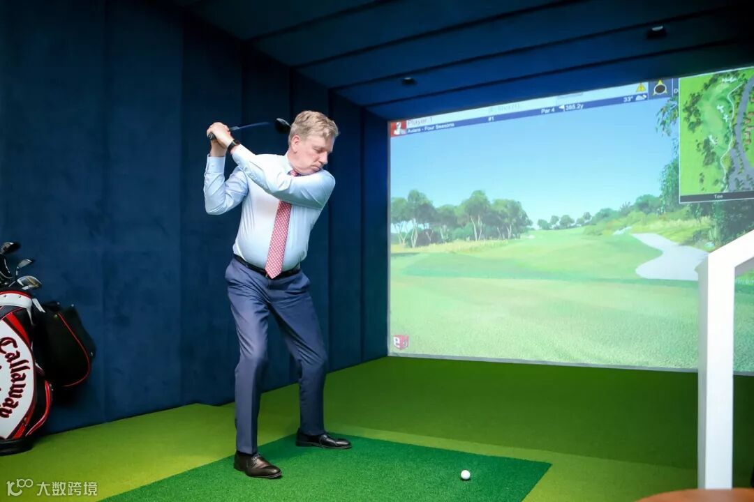 △除了喜欢阅读之外,阿霍先生更是高尔夫球的爱好者。当经过汇悦台会所的模拟高尔夫球室时,他脱下了外套体验挥杆。