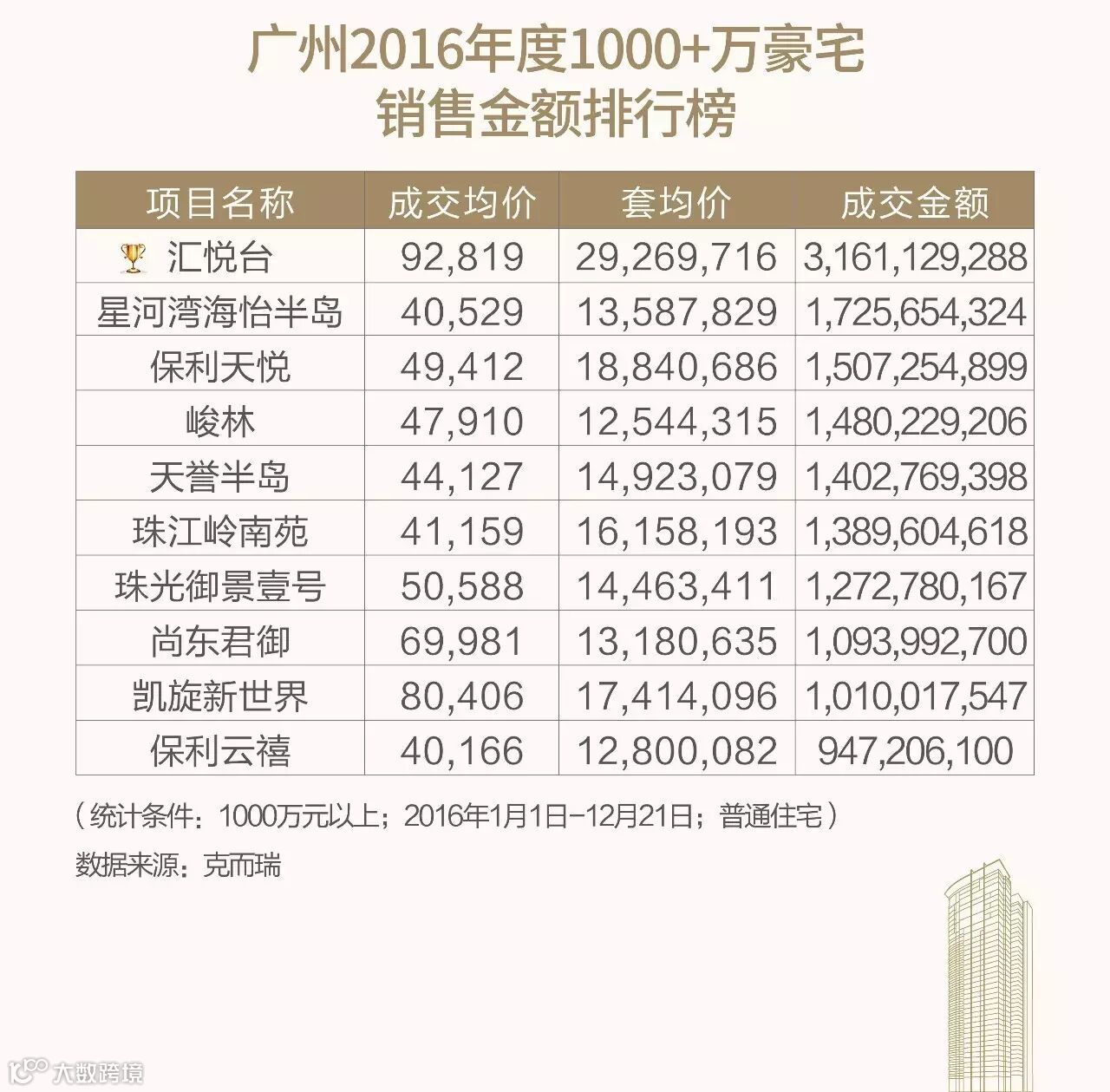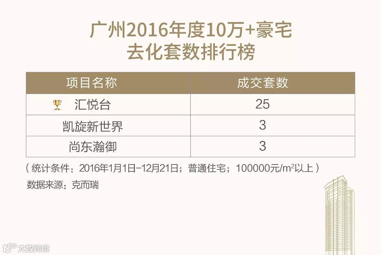 根据这份统计数据,2016年广州成交均价超过10万元/平方米的住宅成交套数总共31套,其中有25套是汇悦台,占比达到80%。汇悦台网签总成交金额达到31.6亿元,是千万级以上豪宅的成交金额的冠军,比第二名的成交金额(17.3亿元)高出80%之多。
