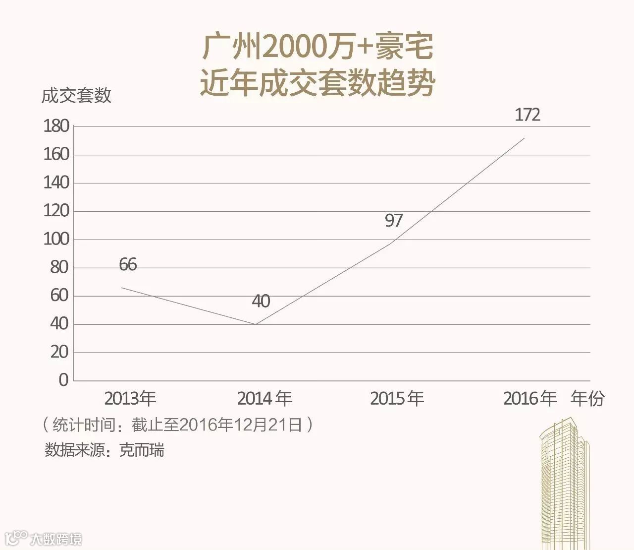 广州两千万以上豪宅的成交量正呈现出逐年上升的趋势。克而瑞2016年度豪宅数据(统计时间为1月1日至12月21日)显示,广州2014年共成交40套两千万级豪宅,到2015年,这一数字上升为97套,今年更是取得172套的成交量,两年时间增加三倍多。而这172套豪宅中,有90套出自侨鑫·汇悦台,占比超过了50%。