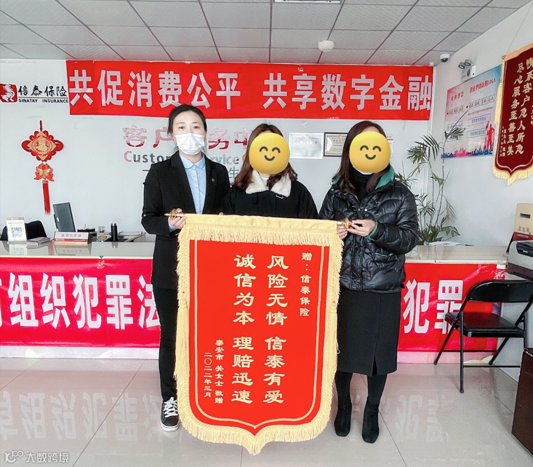 近日,信泰保险泰安中支完成一笔理赔案件,得到了客户的高度认可。为表示感谢,客户关女士亲自赠送“风险无情 信泰有爱,诚信为本 理赔迅速”的锦旗!