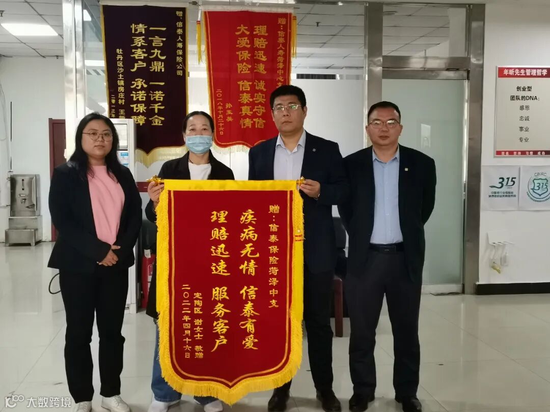 2022年4月19日,客户谢女士向信泰保险菏泽中心支公司赠送了一面印有“疾病无情,信泰有爱,理赔迅速,服务客户”的锦旗,表达了对信泰理赔工作的肯定,同时对信泰保险主动理赔、为客户提供温暖的服务表达了高度的赞誉。