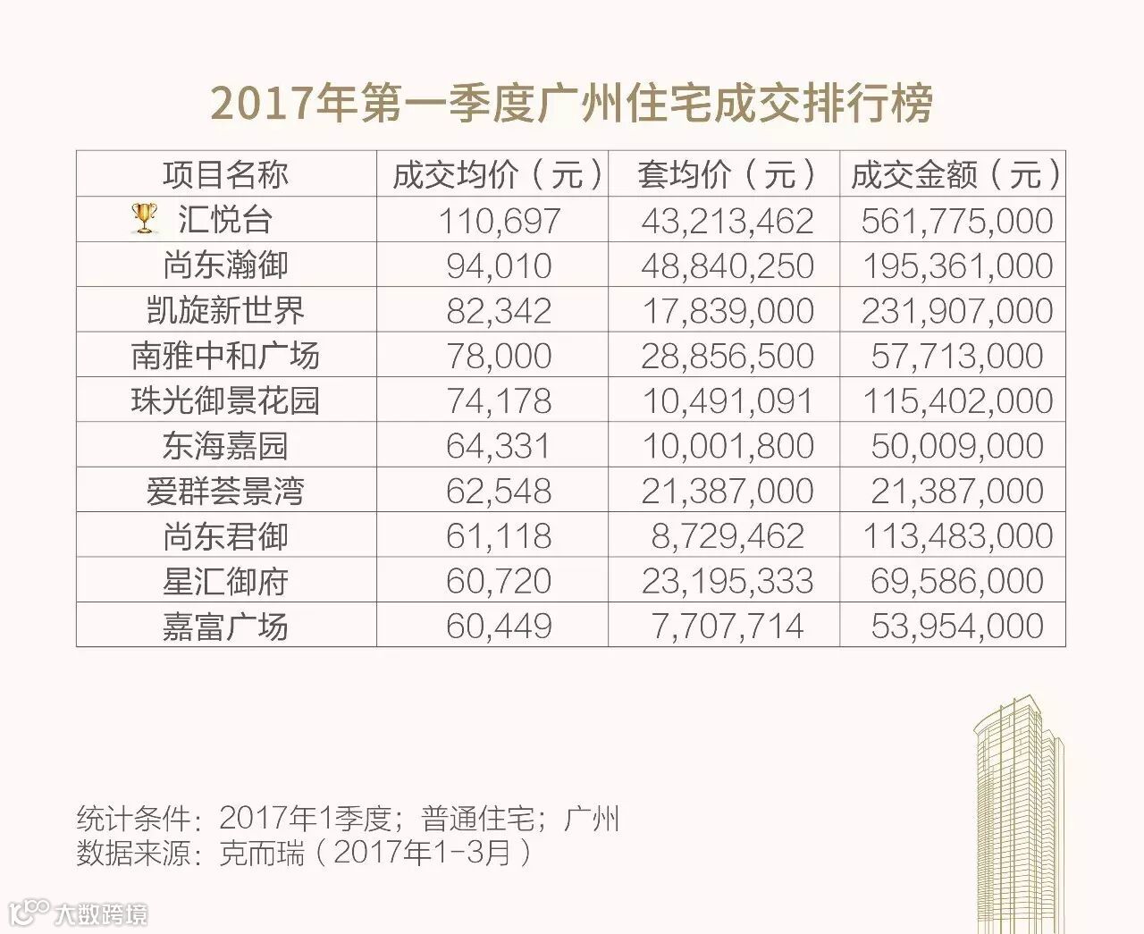 由数据研究可知,在广州一季度总价2000万以上的豪宅中,汇悦台稳居成交均价、成交套数、成交总额等的榜首位置。