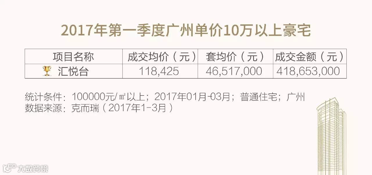 从数据上分析,广州一季度成交单价超过10万/平方米的住宅,全部集中在汇悦台,在领跑广州之余,更是比肩其他一线城市,为广州涨气势。